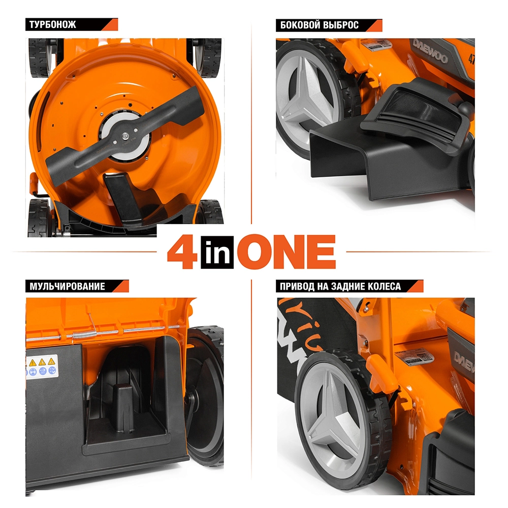 Функции 4-в-1. Кошение травы, сбор в травосборник, боковой выброс и мульчирование. Конструкция газонокосилки позволяет быстро и без применения специальных инструментов изменить режим работы для решения любых задач по уходу за газоном.