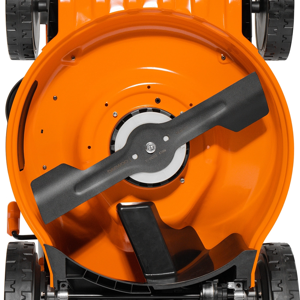 Колеса на подшипниках. Колеса установлены на подшипниках, что обеспечивает плавное движение газонокосилки и увеличивает ресурс. Закрытая внутренняя часть колес предотвращает попадание травы и грязи внутрь механизма колеса, сохраняя чистоту и работоспособность узлов.