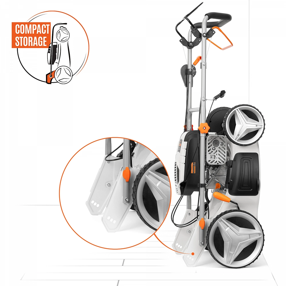 Вертикальное хранение. Современная конструкция двигателя и складная рукоятка позволяют компактно хранить газонокосилку в вертикальном положении.