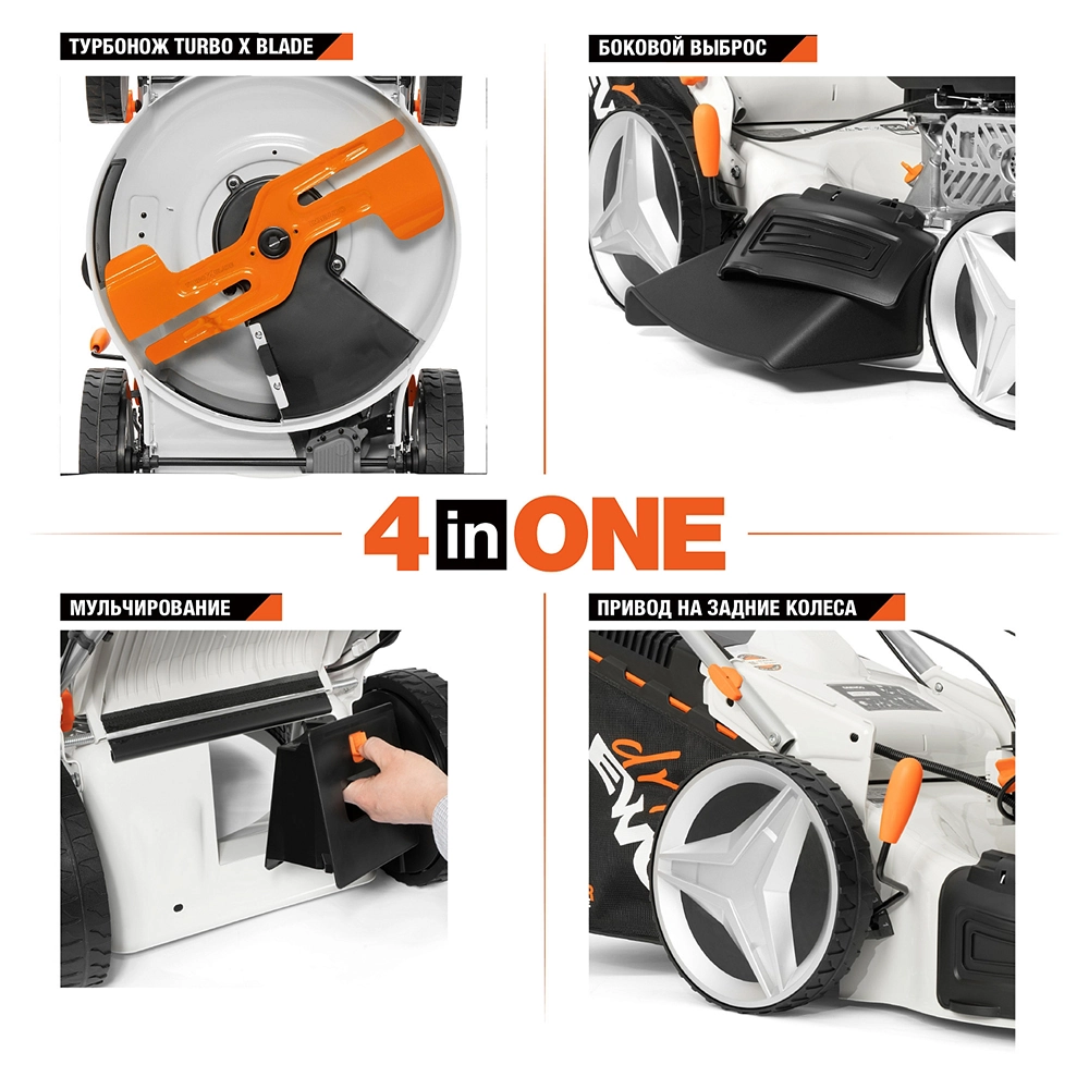 Функции 4 в 1. Кошение, сбор травы в травосборник, боковой выброс и мульчирование. Конструкция газонокосилки и нож TURBO X BLADE позволяют быстро менять режим работы без использования инструментов и замены ножа, обеспечивая удобное решение любых задач по уходу за газоном.
