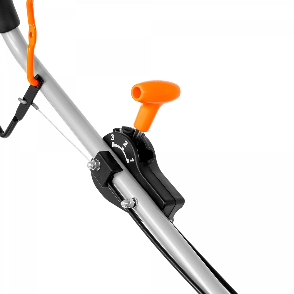 Центральная регулировка высоты среза. 10 ступенчатая центральная регулировка высоты кошения от 25 до 75 мм позволяет выбрать оптимальную высоту травы, в зависимости от назначения газона. Настройка режущей деки производится в одно движение — путем смещения удобно расположенного рычага, который одновременно изменяет высоту подъема передних и задних колес.