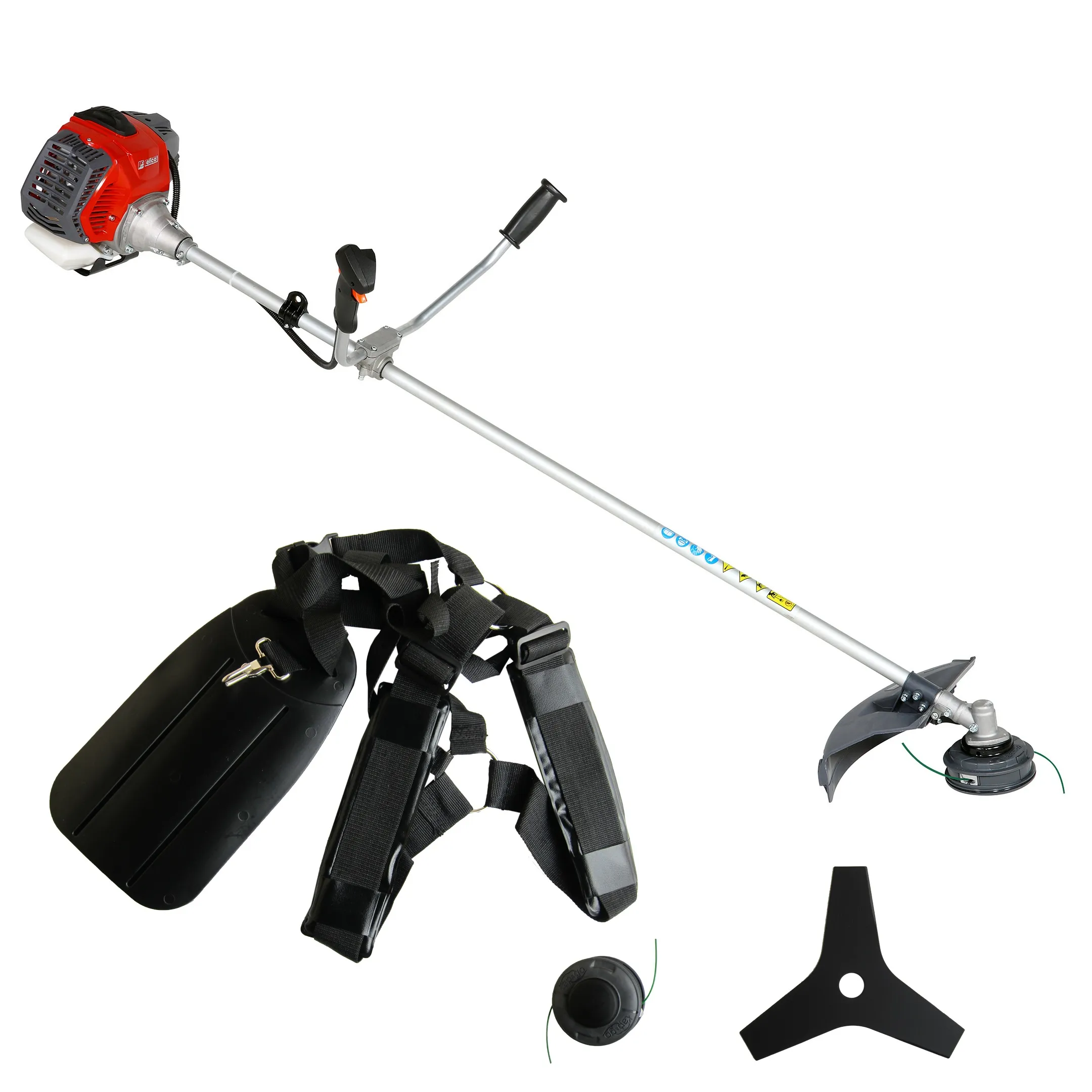 Комплектация | двигатель, велосипедная рукоять, двухплечный ремень-разгрузка, триммерная головка-автомат TAP&GO D130 мм, трехлопастный нож - 1 шт., свечной ключ, набор ключей (2 шт), крепления для ножа, мерный стакан, инструкция по эксплуатации, коробка |