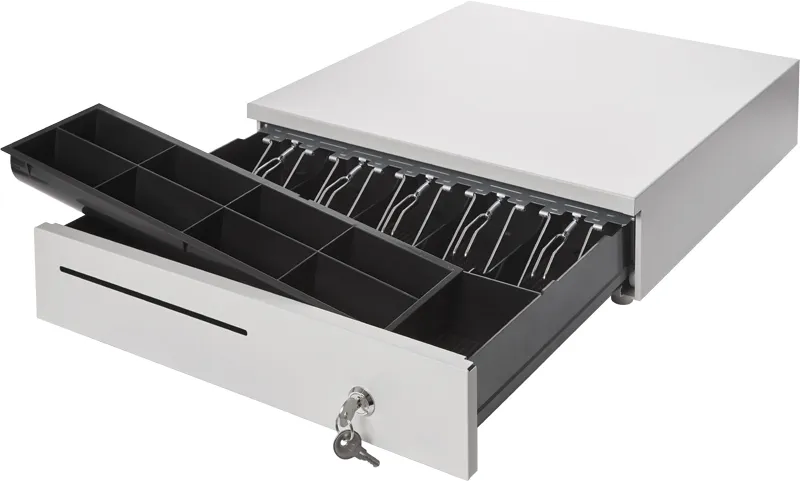 Ящик содержит 14 мест хранения: пять ячеек с металлическими фиксаторами для банкнот, восемь – для монет и один дополнительный отсек для чеков и ценных бумаг. Отделения для банкнот в этой модели специальным образом расширены и обладают покатым краем, обеспечивая удобство работы с купюрами. Монетница вынимается.