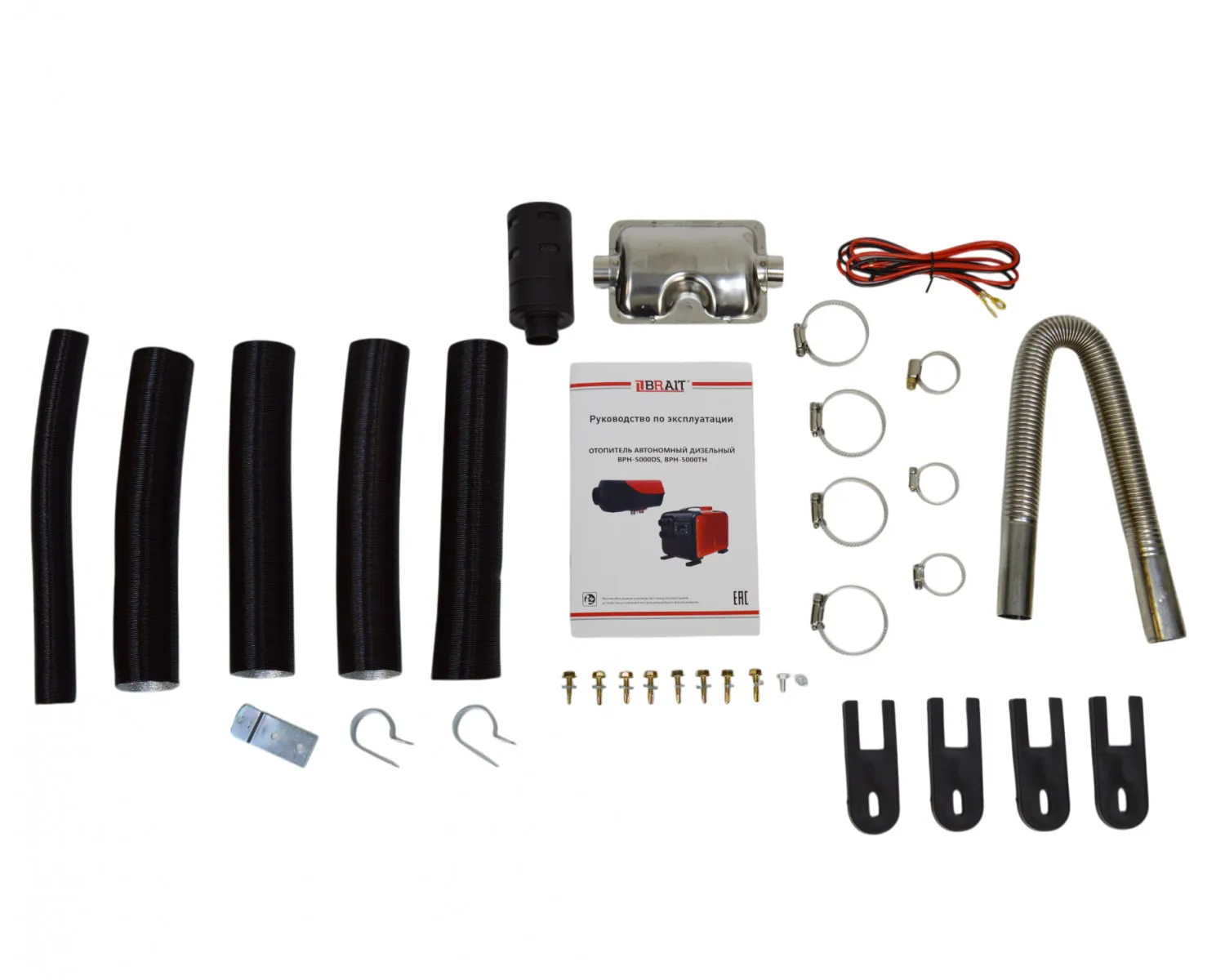 | Комплектация | Гофрированная труба для воздуховыпускного отверстия (50 см) 1 шт; Труба для отвода выхлопных газов (50 см) 1 шт; Хомут для труб (026-030) 3 шт; Хомут для труб (039-046) 4 шт; Фильтр воздушный 1 шт; Глушитель 1 шт; Пульт ДУ 1 шт; Кабель питания (1 м) 1 шт; Руководство по эксплуатации 1 шт. |