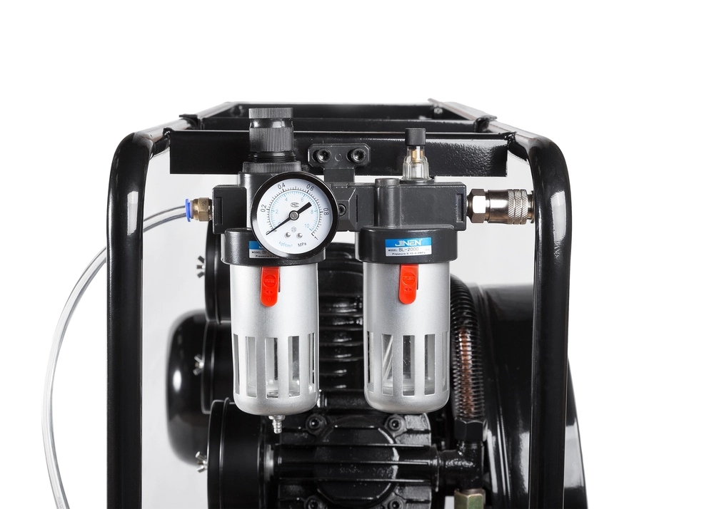 В комплекте идет блок подготовки воздуха (влагомаслоотделитель) с регулятором и манометром. Служит для тонкой очистки выработанного компрессором воздуха от инородных механических примесей, влаги и масла.