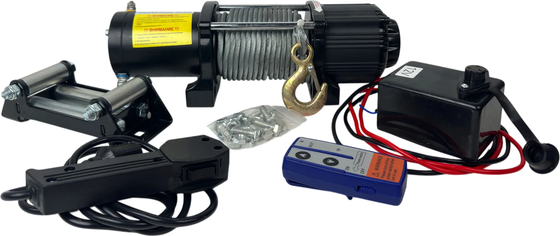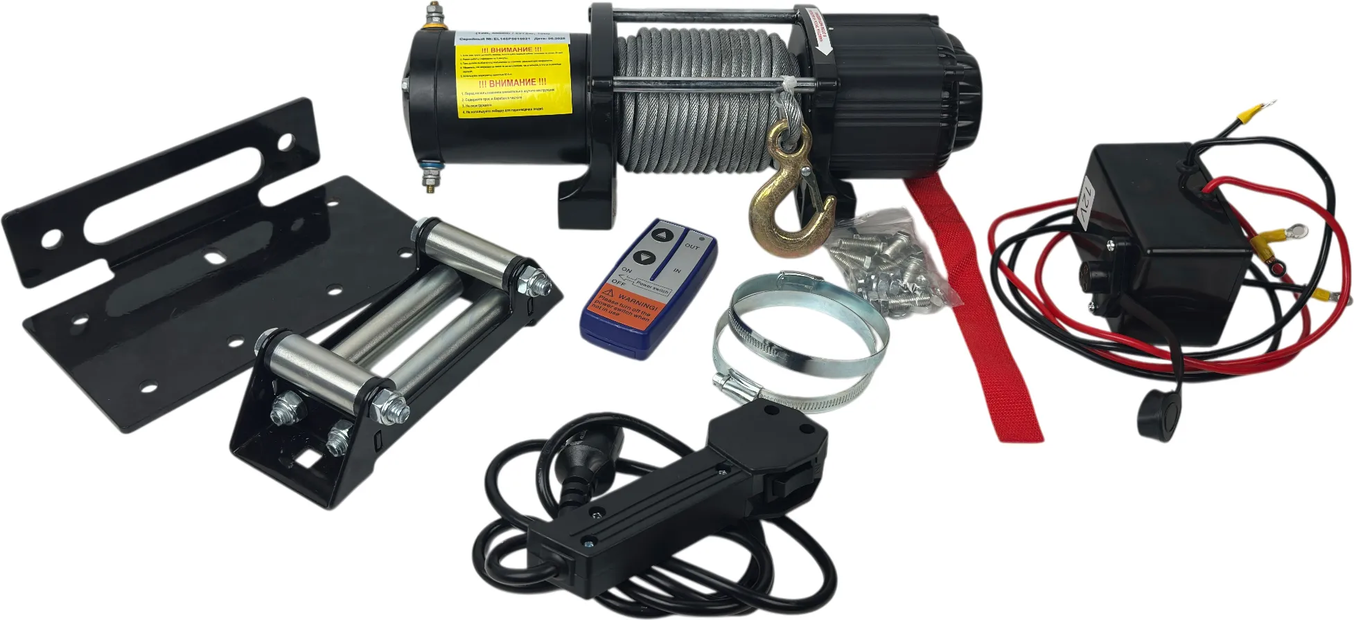 | Комплектация | лебедка, проводной пульт, беспроводной пульт, направляющая троса, лента вытягивания троса, площадка под лебедку, болты крепления лебедки, блок управления, паспорт |