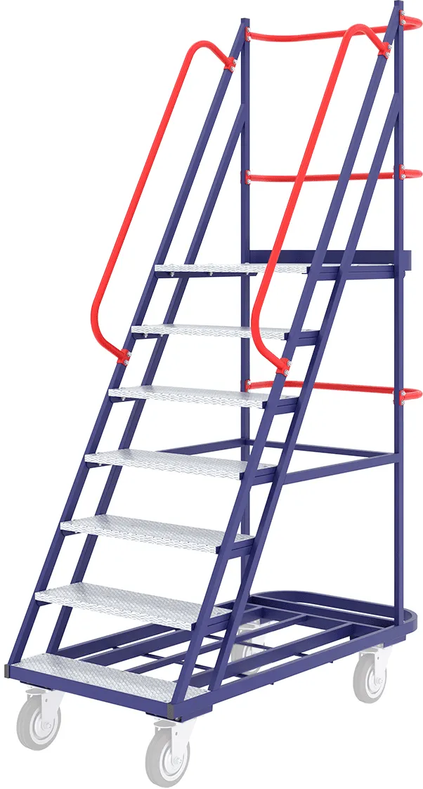 Полимерная порошковая окраска позволяет работать на открытом воздухе при атмосферных осадках. Основной цвет мобильной лестницы — синий, RAL 5002. Вариант покрытия ступеней, рабочей площадки, ограждений и поручней — красный, RAL 3020.
