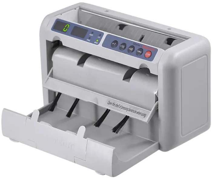 Устройство работает на любой ровной поверхности. Скорость подсчета достигает 800 банкнот в минуту. Вместимость лотка: 100 банкнот.