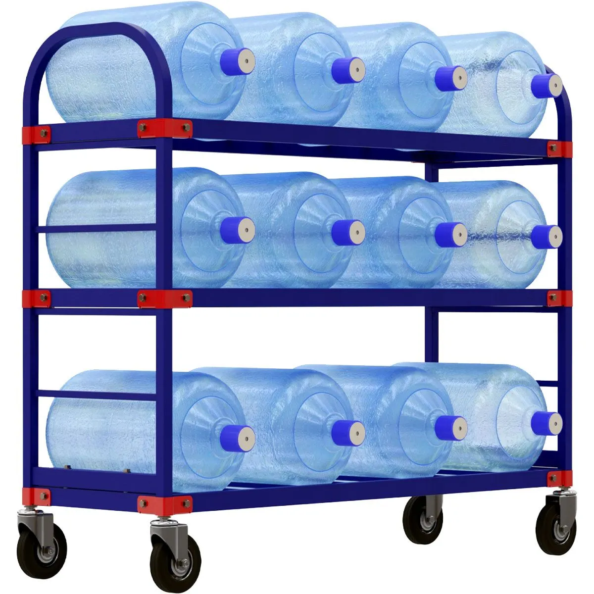 Передвижной стеллаж для 19-ти литровых бутылей с водой ТСВД 12 может использоваться как на производствах, в офисах, так и в торговых сетях. Направляющие для бутылей имеют легкий угол наклона, что позволяет надежно фиксировать емкость в своей ячейке. Стеллаж изготовлен из труб прямоугольного, квадратного и круглого сечения. Поставляется в разобранном виде. Сборка осуществляется при помощи штампованных уголков, которые жестко крепят полки к ручке.