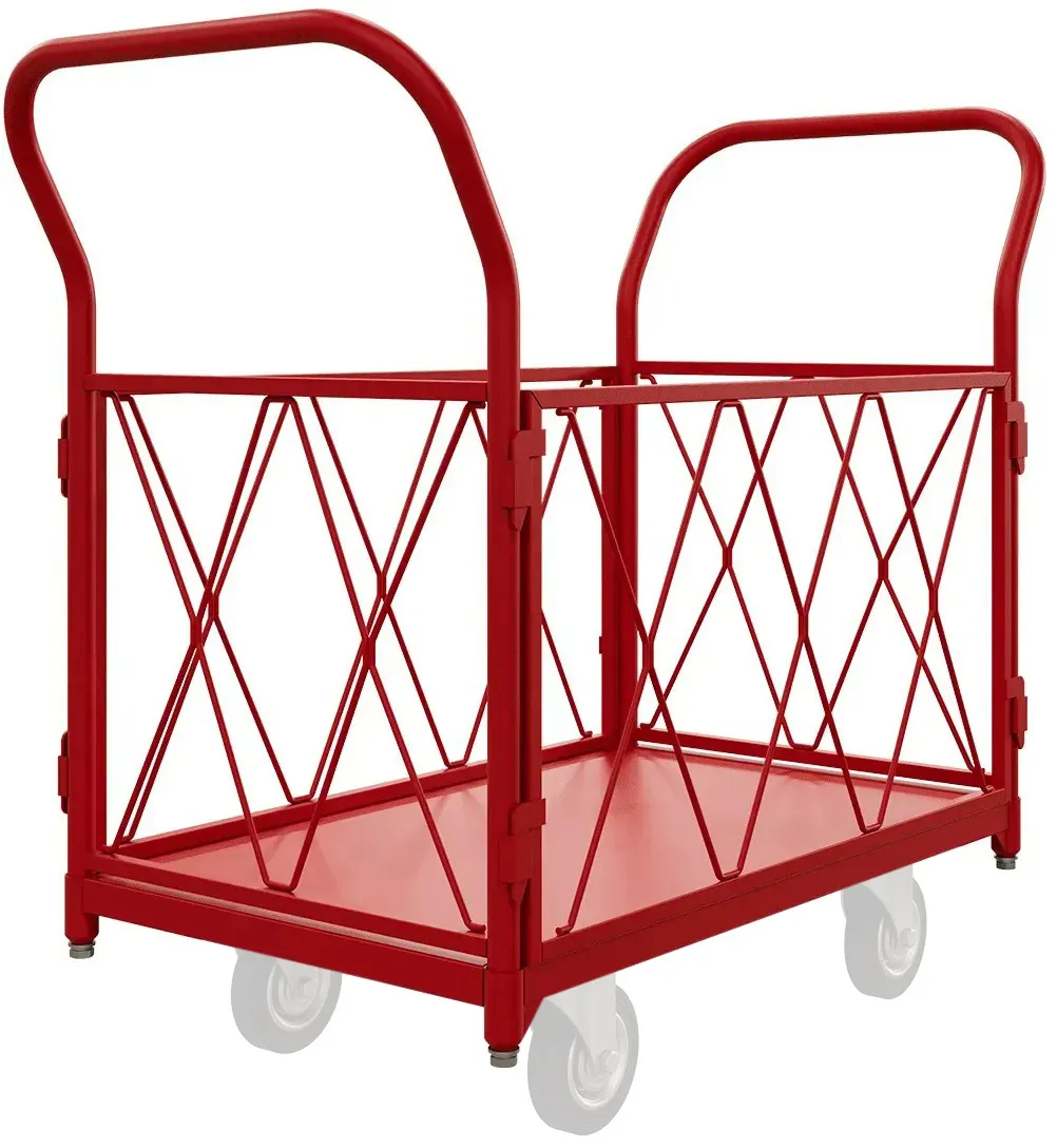 Каркас платформы из трубы 30х20 мм, настил металлический лист 0,8 мм, съемные борта высотой 440 мм изготовлены из трубы 15х15 мм, заполнение борта Ø 6,0 мм.