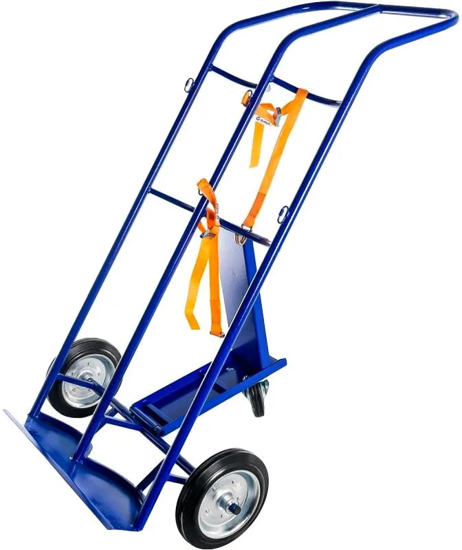 Тележка для перевозки двух баллонов (пропанового и кислородного) КП 2 с фиксацией ремнем и литыми колесами грузоподъемностью до 220 кг. Каркас тележки выполнен из трубы круглого сечения диаметром 25 мм, ложементы для установки баллонов выполнены из профильной трубы 15 мм.