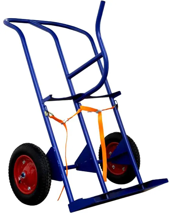 Тележка КП 2 У с фиксацией ремнем и пневматическими колесами предназначена для транспортировки двух баллонов (пропанового и кислородного), а также газового оборудования для резки (шланг, резак, редуктор). Каркас тележки выполнен из трубы круглого сечения диаметром 30 мм, ложементы для установки баллонов изготовлены из листового материала.