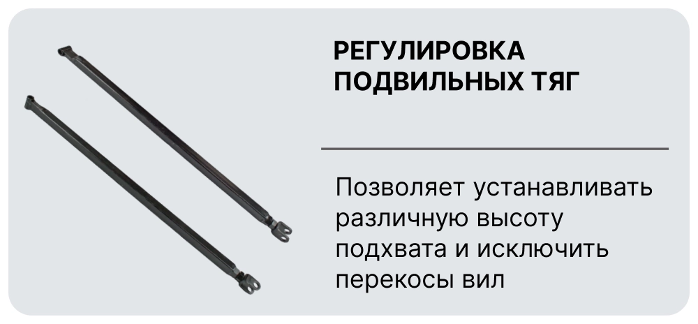 - Функция регулировки подвильных тяг для исключения перекосов вил при интенсивной эксплуатации