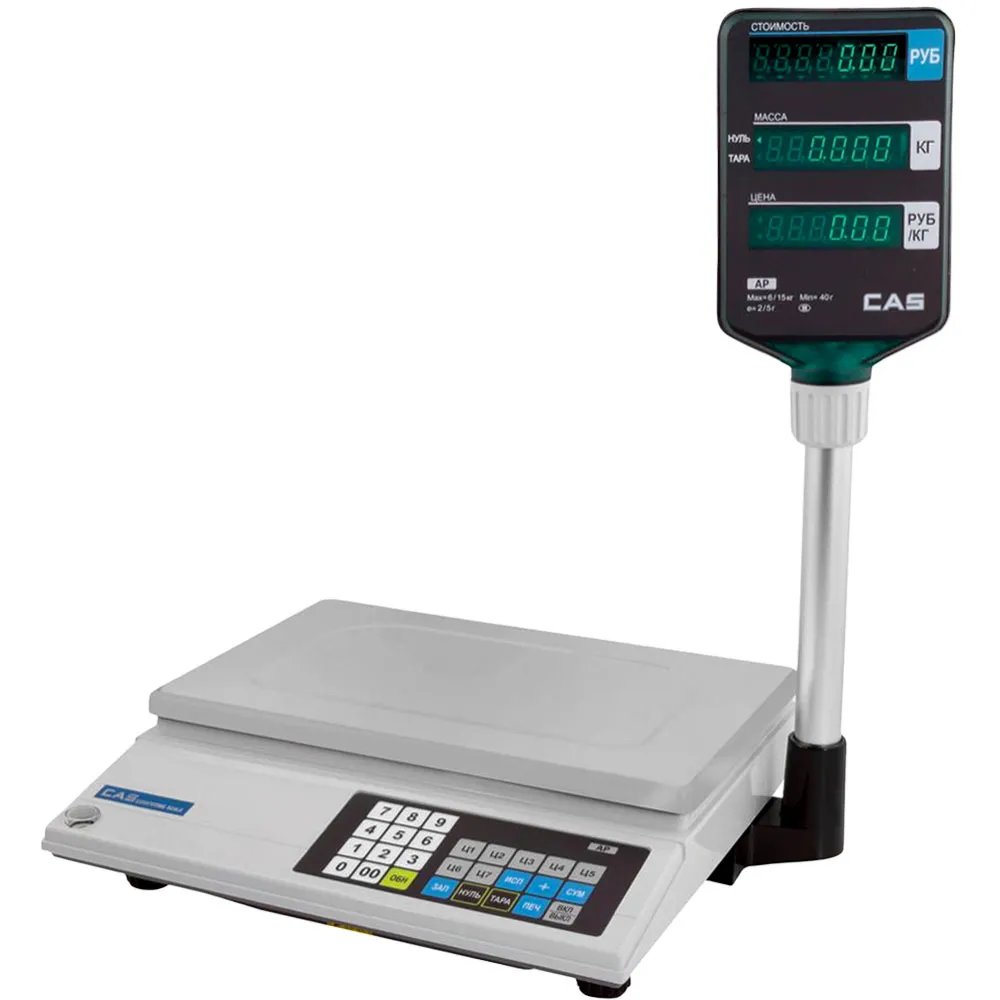 Настольные торговые весы со стойкой CAS AP-1 (15M) (220х340), с максимальным пределом взвешивания 15 кг. используются на предприятиях общественного питания и торговли. Модель оборудована двухсторонним флуоресцентным дисплеем на стойке, имеет функцию автоматической установкой нуля и регулировку коэффициента усиления.