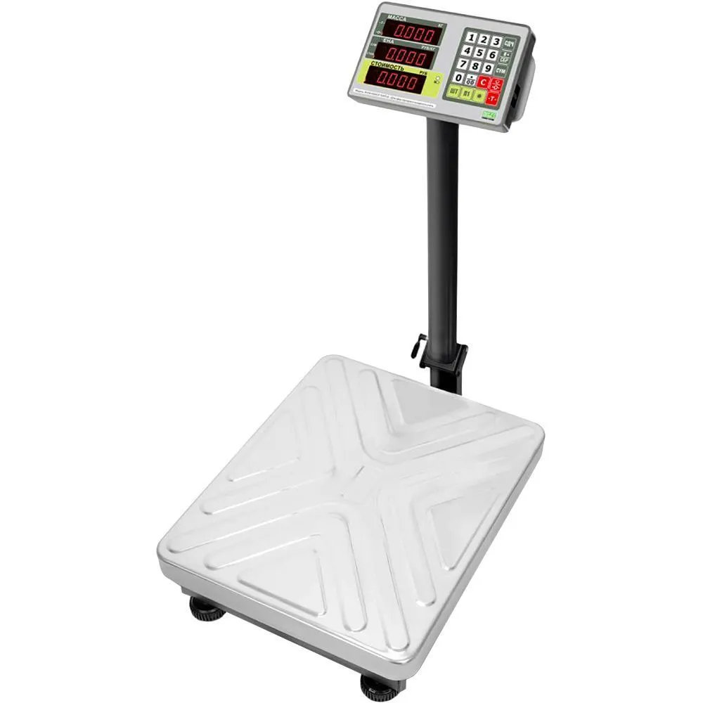 Рама изготовлена из стали. Конструкция дополнена элементами из пластика. Весовая платформа сделана из металла. Габариты корпуса: 620*400*970 мм. Размер платформы: 520*420 мм. Установлена кнопочная клавиатура для управления. Значение кнопок интуитивно понятно. Результаты измерений выводятся на LED-дисплей. Это двустороннее табло формата продавец-покупатель. Дисплей показывает массу товара, стоимость покупки, сумму сдачи.