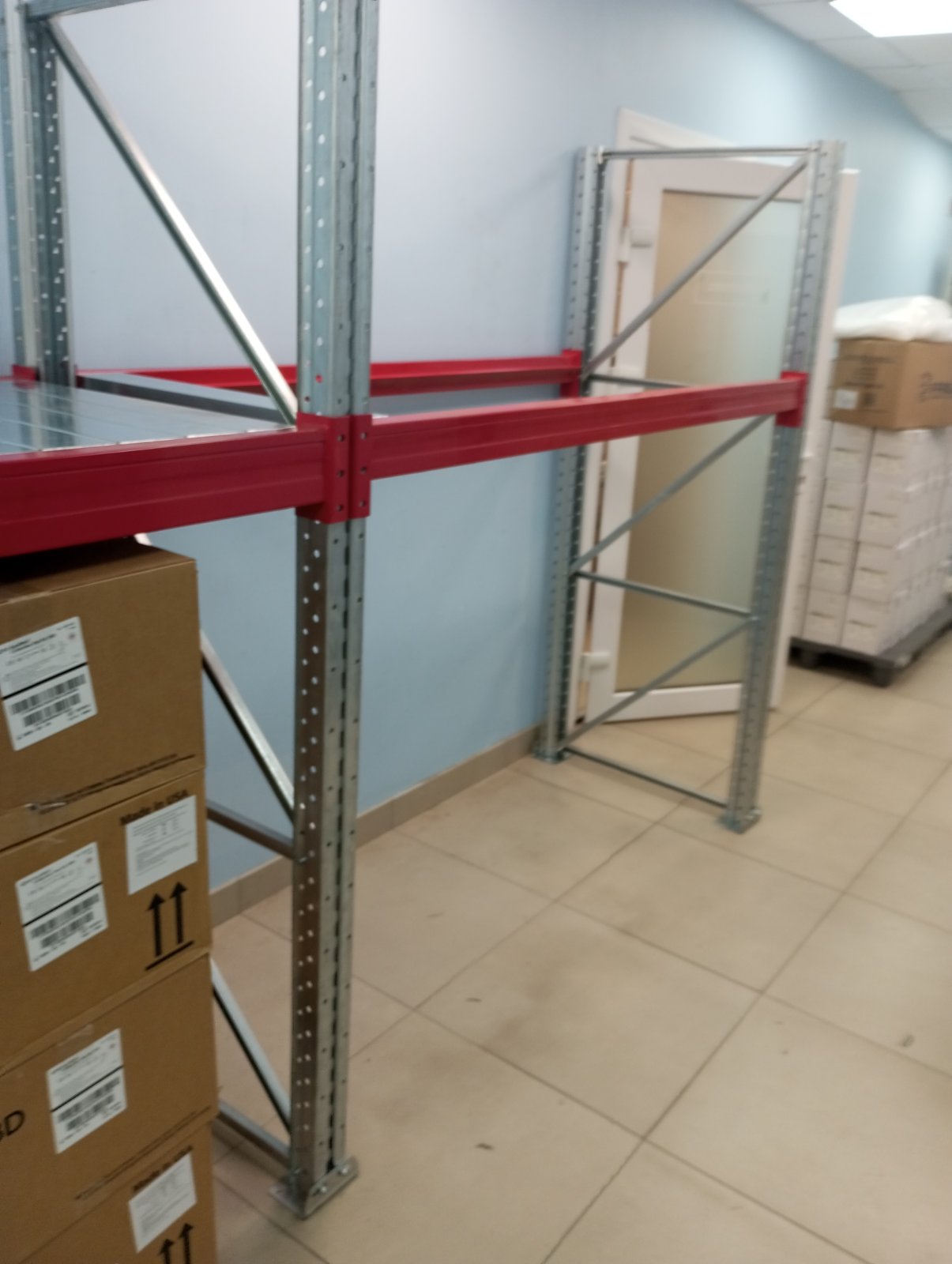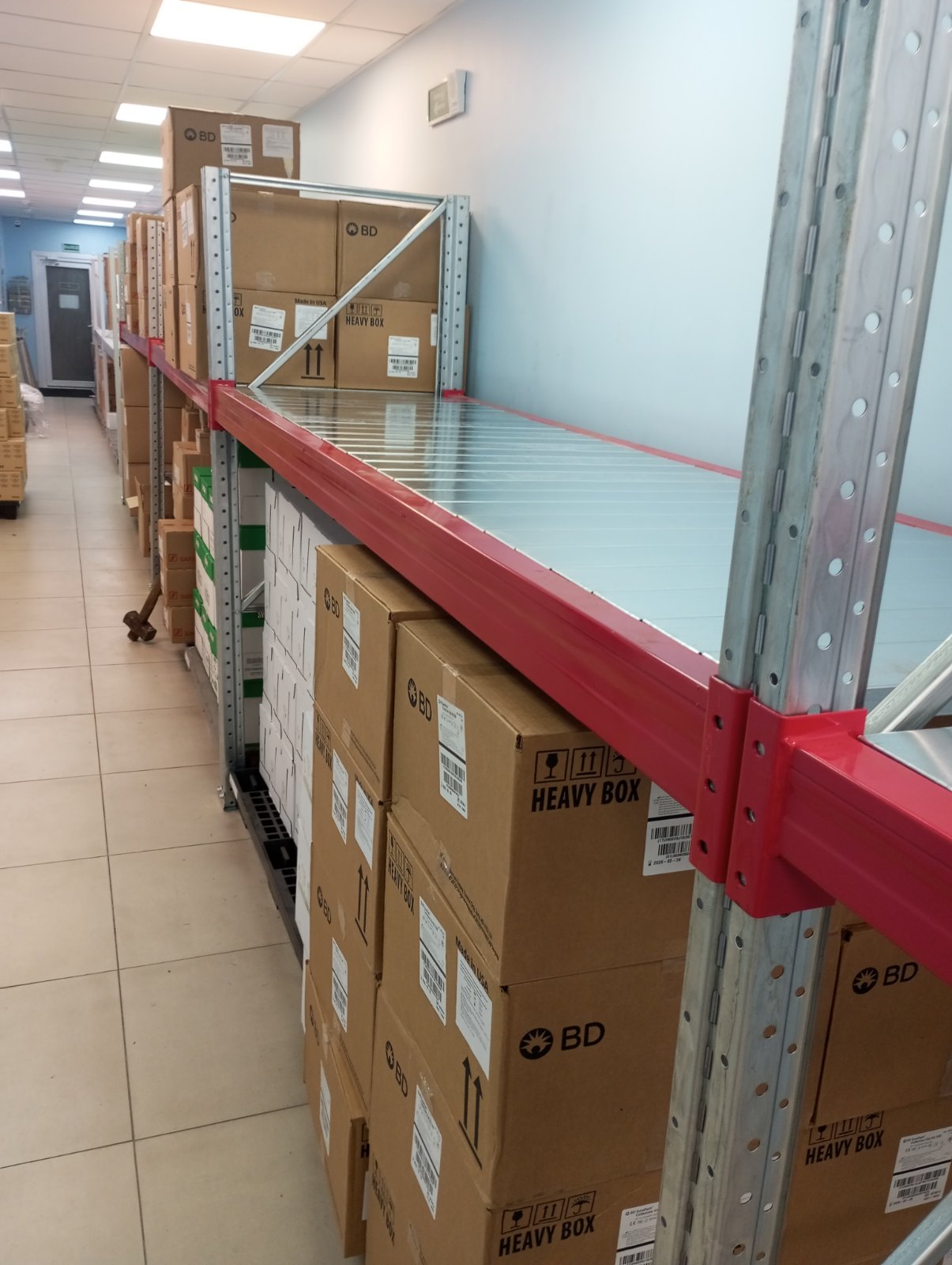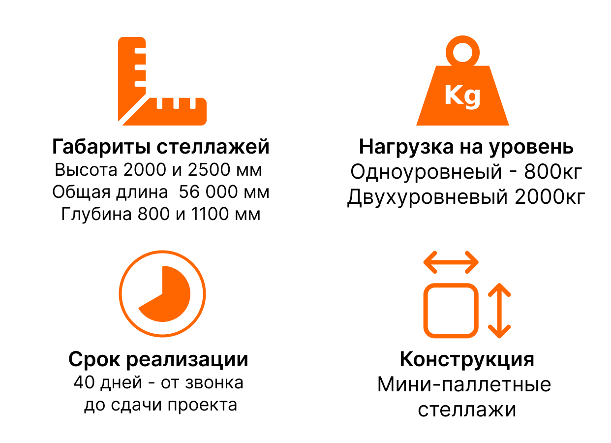 Чтобы эффективно использовать имеющееся пространство, нами был предложен проект складских стеллажей с настилом (мини-паллетные стеллажи). Такое решение позволило увеличить площадь хранения и использовать усиленные конструкции для повышения несущей способности конструкции, тогда как несущая способность стандартных полочных стеллажей значительно меньше.