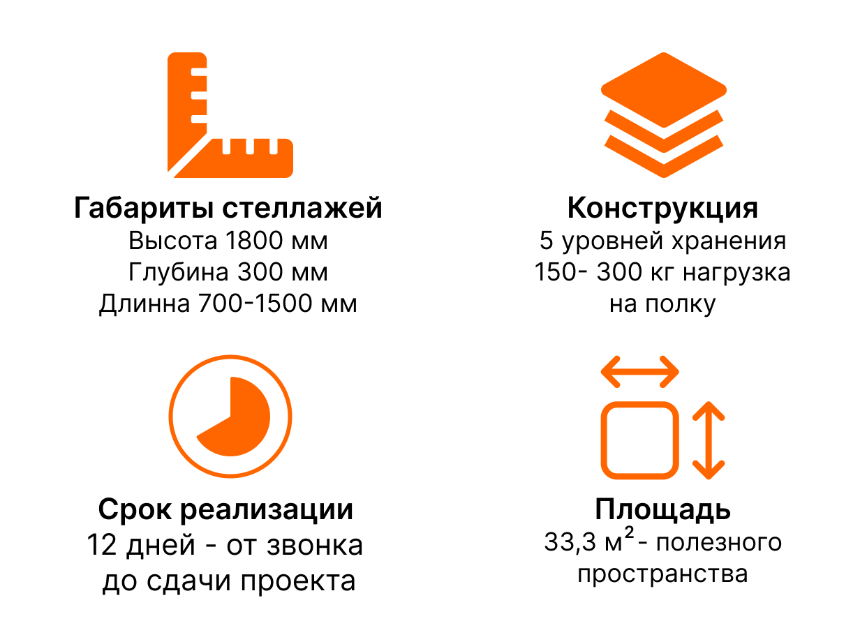 Проект состоял из 20 стеллажей, высота каждого 1,8 м, глубина полки 0,3 м. Для того чтобы максимально использовать полезное пространство комнаты, были взяты полки шириной 0,7 м, 1 м, 1,2 м 1,5 м. В каждом стеллаже 5 уровней хранения, нагрузка на полку 150-300 кг в зависимости от ширины полки. Общая нагрузка на стеллаж 750-1500 кг. Таким образом удалось получить 33,3 м2 полезной площади и обеспечить удобство хранения архивных документов.