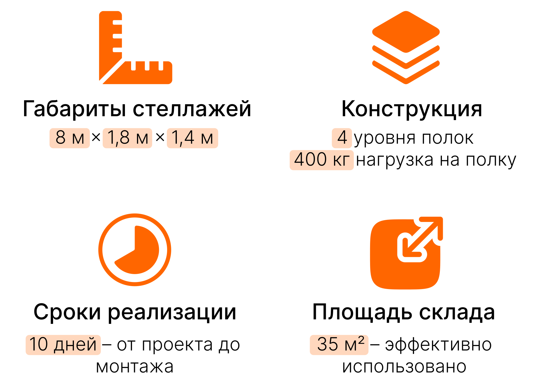 Нами были разработаны и реализованы полочные стеллажи типа САМ с увеличенной глубиной полок (1400 мм), что позволило удобно размещать крупногабаритные изделия. Благодаря продуманной планировке удалось полностью задействовать помещение площадью 35 м², обеспечив при этом удобный доступ к товару.
