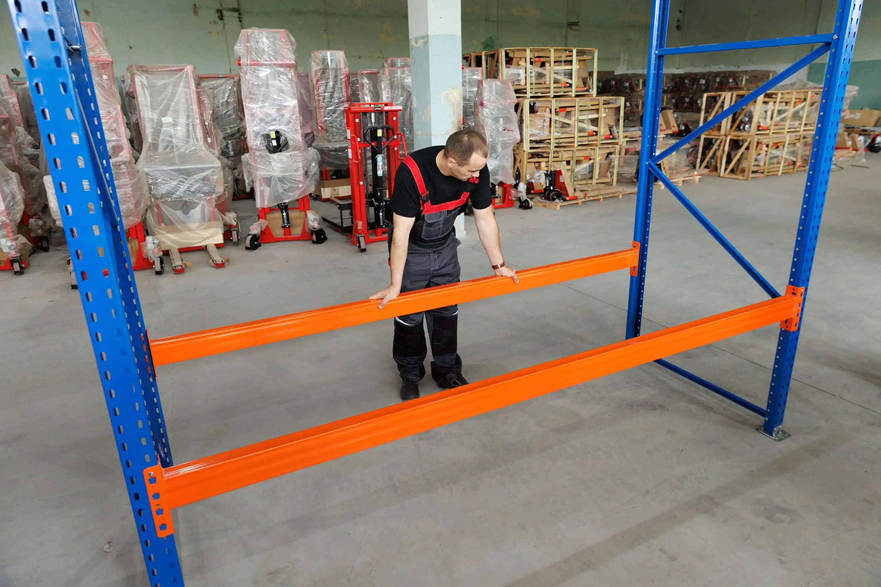 Основу системы составляют прочные стальные стойки, соединенные горизонтальными и диагональными связями, формируя устойчивую раму. Регулируемые балки дают возможность изменять высоту ярусов под разные паллеты. Для дополнительной надежности стеллажи крепятся к полу и стенам при необходимости, а фиксаторы предотвращают смещение балок при погрузке.